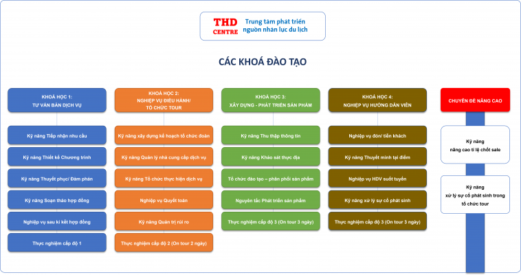 Xây dựng và phát triển sản phẩm là một hoạt động thường xuyên diễn ra trong doanh nghiệp lữ hành, nhằm đảm bảo sản phẩm của doanh nghiệp luôn có tính mới, cập nhật. Với ý nghĩa đó, THD Centre cung cấp khoá học với mục tiêu trang bị cho người học các kiến thức, kỹ năng để xây dựng, phát triển sản phẩm du lịch hiệu quả. Các nội dung chính của khoá học gồm: